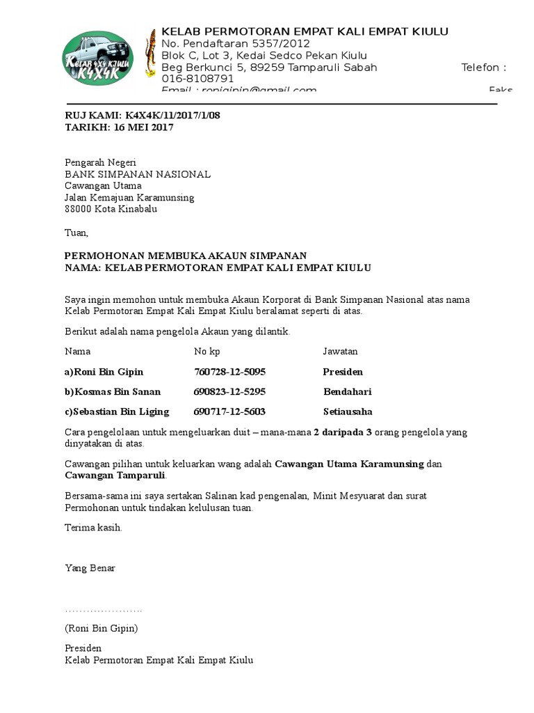 Contoh Surat Permohonan Membuka Akaun Kelab