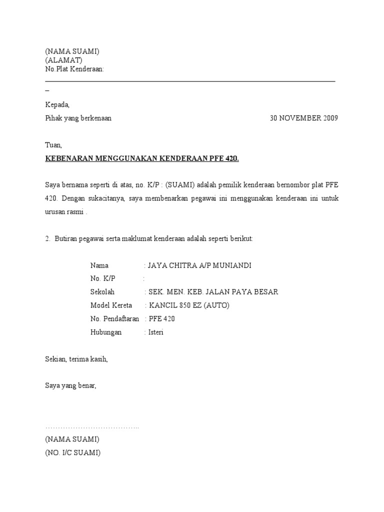 Contoh Surat Kebenaran Menggunakan Kenderaan Suami